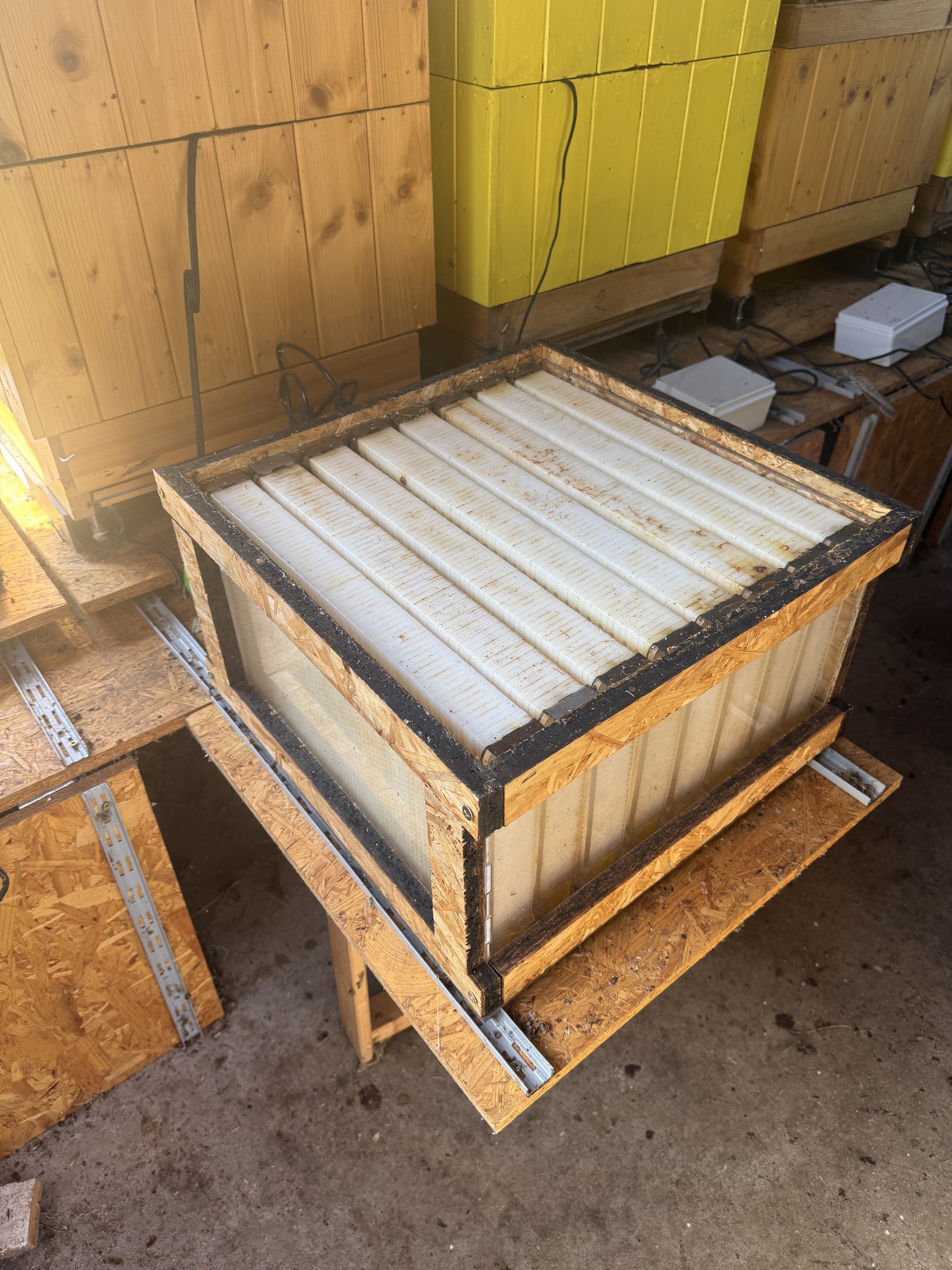 Průhledný nástavek umožňuje včelaři jedinečný pohled do úlu a detailní sledování práce včel. Díky průhledným stěnám lze pozorovat, jak včely postupně zaplňují samovytáčecí rámky: